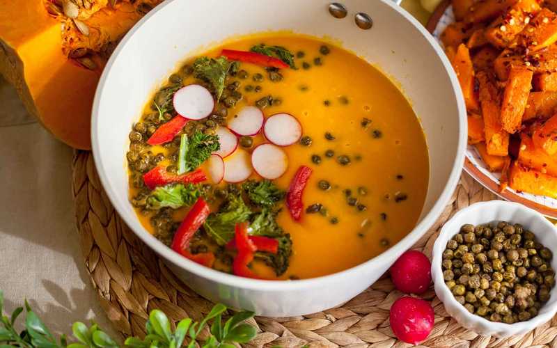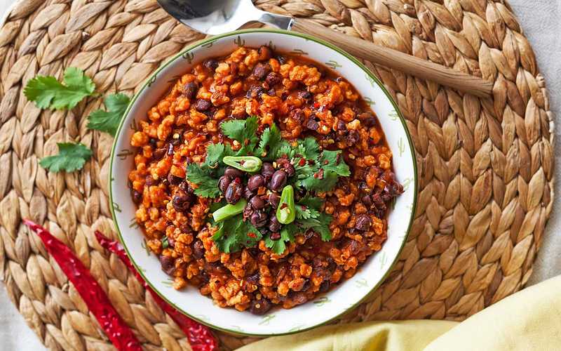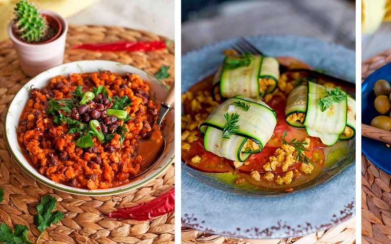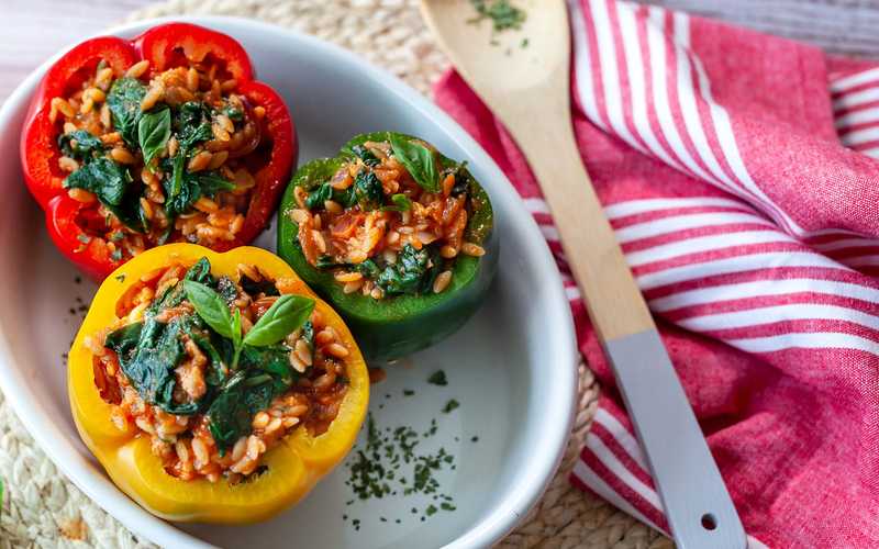 Pimientos rellenos de arroz de lentejas rojas y soja texturizada