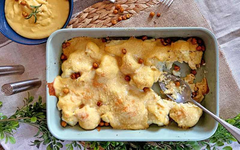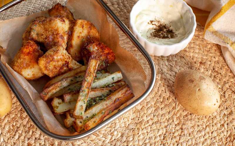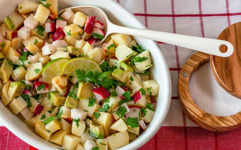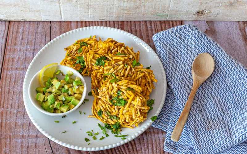 Hash brown de plátano macho con salsa kéfir y aguacate