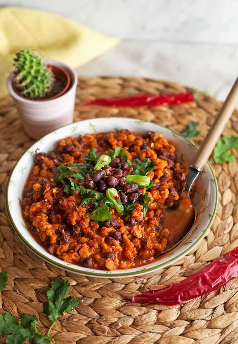 También puedes hidratarla en el guiso que hagas, es una buena forma para garantizar el éxito de la receta. La soja texturizada es un producto muy facilón, requiere tan solo 30 minutos de reposo en un caldo muy caliente para estar lista. Con la soja texturizada puedes preparar chili vegano, mezclarla con verduras, como sustituta de la carne en una pasta a la boloñesa, para aliñar tus ensaladas o preparar unos ricos tacos vegetarianos. O hacerte una lasaña de berenjenas.