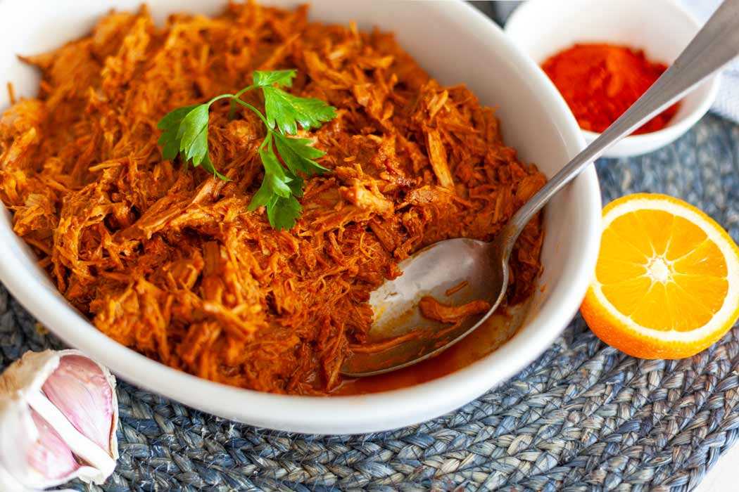 Es una receta típica mexicana del estado de Yucatán. Se caracteriza por su mezcla condimentada con su ingrediente estrella: El achiote. Es una semilla que actúa como colorante en la industria alimentaria (E-160b) y también en cosmética. Sin embargo, los mayas lo usaban para colorear su cuerpo en ritos religiosos. Es muy común marinar la con achiote y más especias. En México puedes encontrar cochinita pibil asada a temperaturas muy bajas en hojas de plátano, esta técnica hace que la receta sea una receta única y deliciosa.