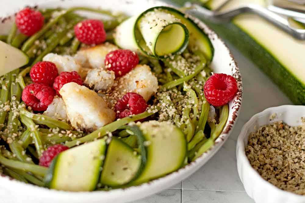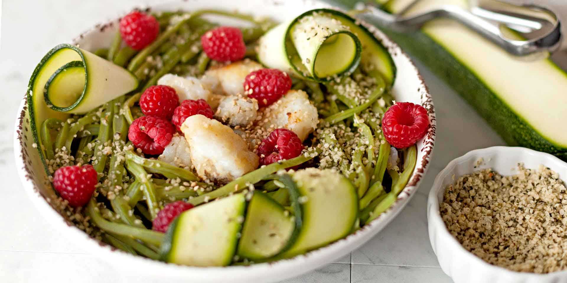 El secreto de cualquier cocina moderna es usar más de 2 fuegos, y el truco para hacerlo más saludable: combinar dos técnicas culinarias: al vapor y plancha. El calabacín está crudo, al igual que las frambuesas. El aliño lo haces al instante y con unas semillas de cáñamo le dan un toque especial.
