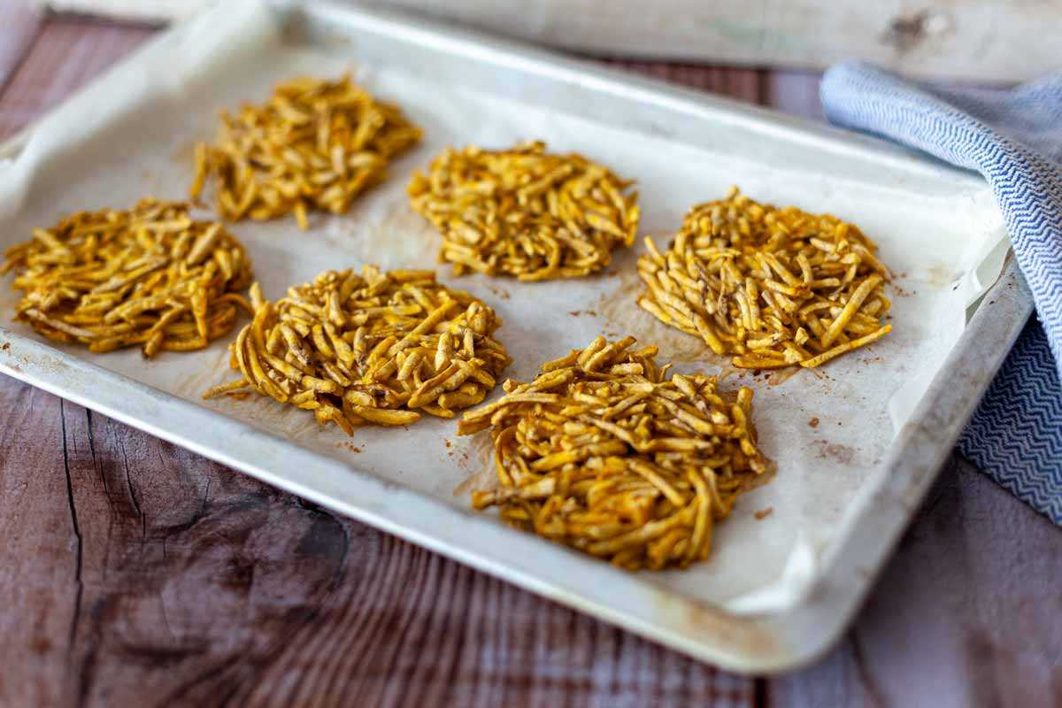 - Coloca en una bandeja para el horno antiadherente, y agrega pequeñas porciones de la mezcla formando tortitas pequeñas y finas.