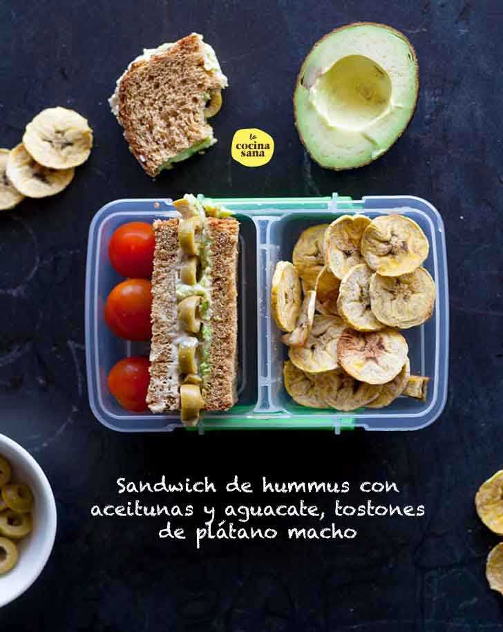 El pan es 100% harina integral, un pan realfood relleno de hummus de garbanzo, aguacate y aceitunas. Para hacerlo más atractivo tiene como acompañamiento chips de plátano macho, solo necesitas laminarlo y hornear a 180ºC durante 10 minutos. ¡Una delicia de tupper sano para el regreso a las clases!