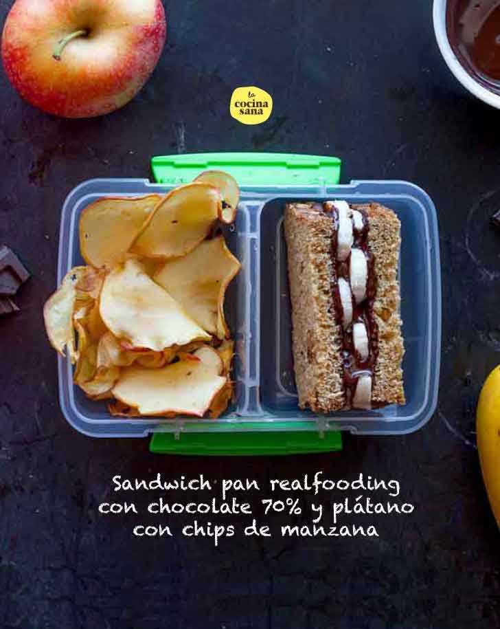 Con la novedad que hemos preparado chips de manzana para hacer este almuerzo sano para el cole o la playa. La nocilla sana puede ser la coconutella o hacerla una versión nutella más saludable. El pan podría ser de espelta integral, casero con semillas y sin amasado como este. ¡PARA COMERLO EN EL MOMENTO!