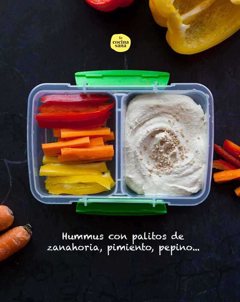 Todo un clásico. En la nevera nunca deben faltar bastones de verduras como zanahoria, pimiento rojo, pepino, pimiento amarillo ¡hasta flores de brócoli crudas! Un bote de garbanzos siempre puede salvar cualquier comida, recuerda que el humus puedes combinarlo con aguacate.