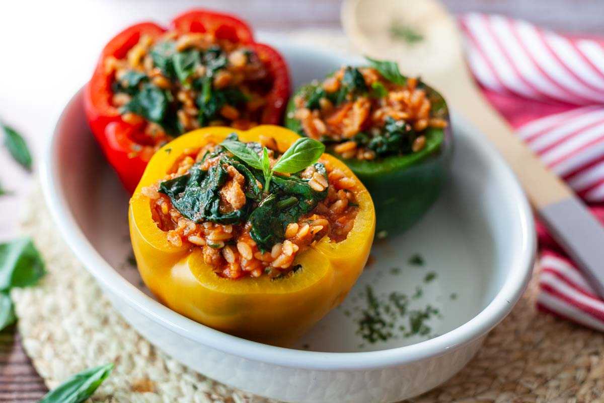 Pimientos rellenos de arroz de lentejas rojas y soja texturizada