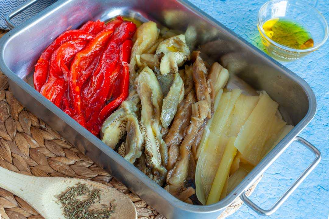 - Quita la piel de la berenjena, corta el pimiento y retira las semillas de su interior, y también retira las primeras capas del puerro.