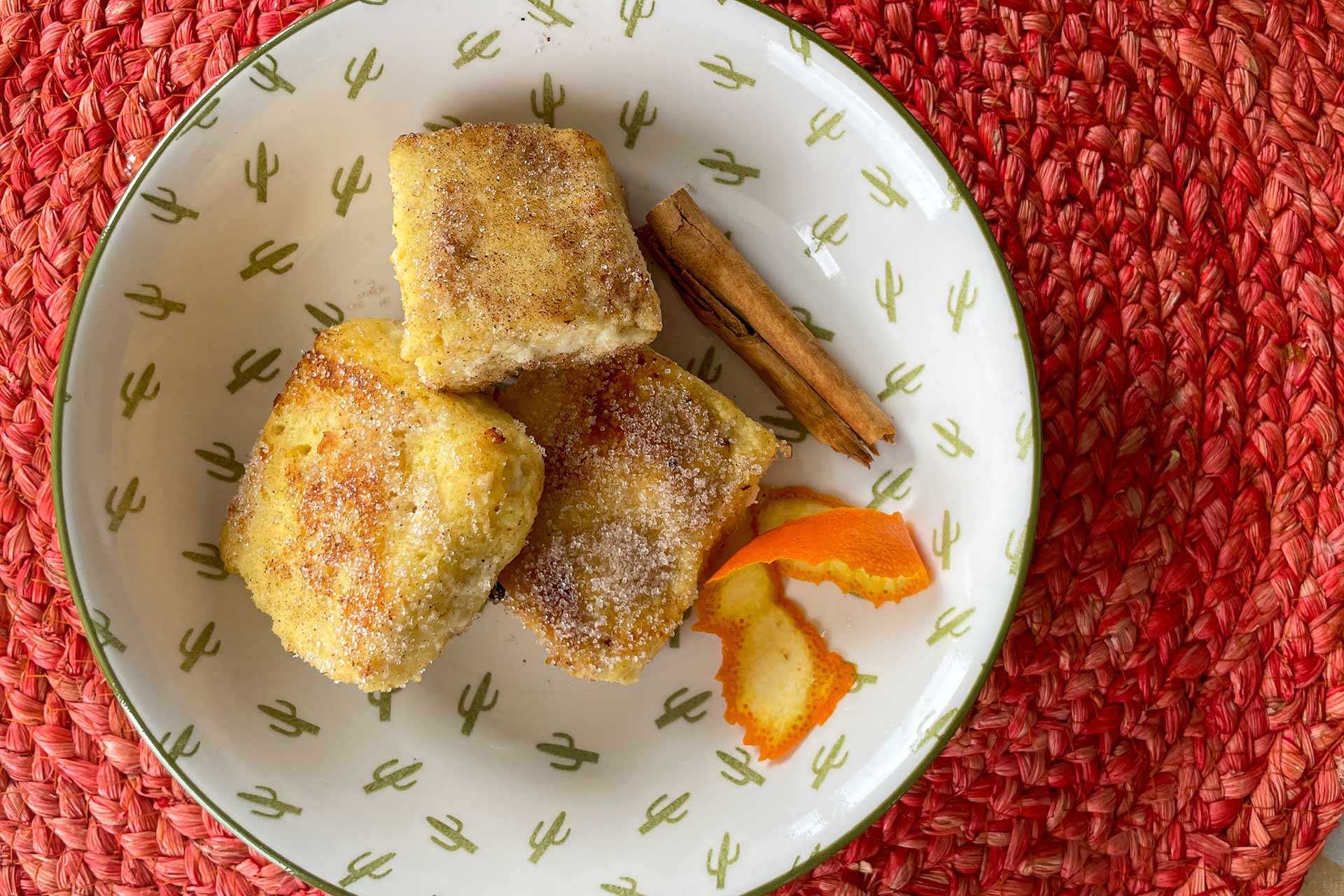 Deja enfriar y desmolda con mucho cariño. Parte el pan en cuadraditos y ponlos en un plato hondo y vierte la leche aromatizada hasta que se empapen bien.